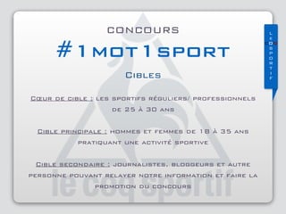 Le document présente le concours '#1mot1sport' organisé par Le Coq Sportif, visant à encourager les sportifs réguliers et professionnels de 18 à 35 ans à décrire leur sport en un mot avec une justification. Les participants peuvent publier sur les réseaux sociaux pour tenter de gagner des prix, tels que des places VIP pour un salon sportif et des réductions sur des articles. Le concours inclut également une diffusion sur Twitter et Instagram pour promouvoir l'événement.