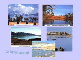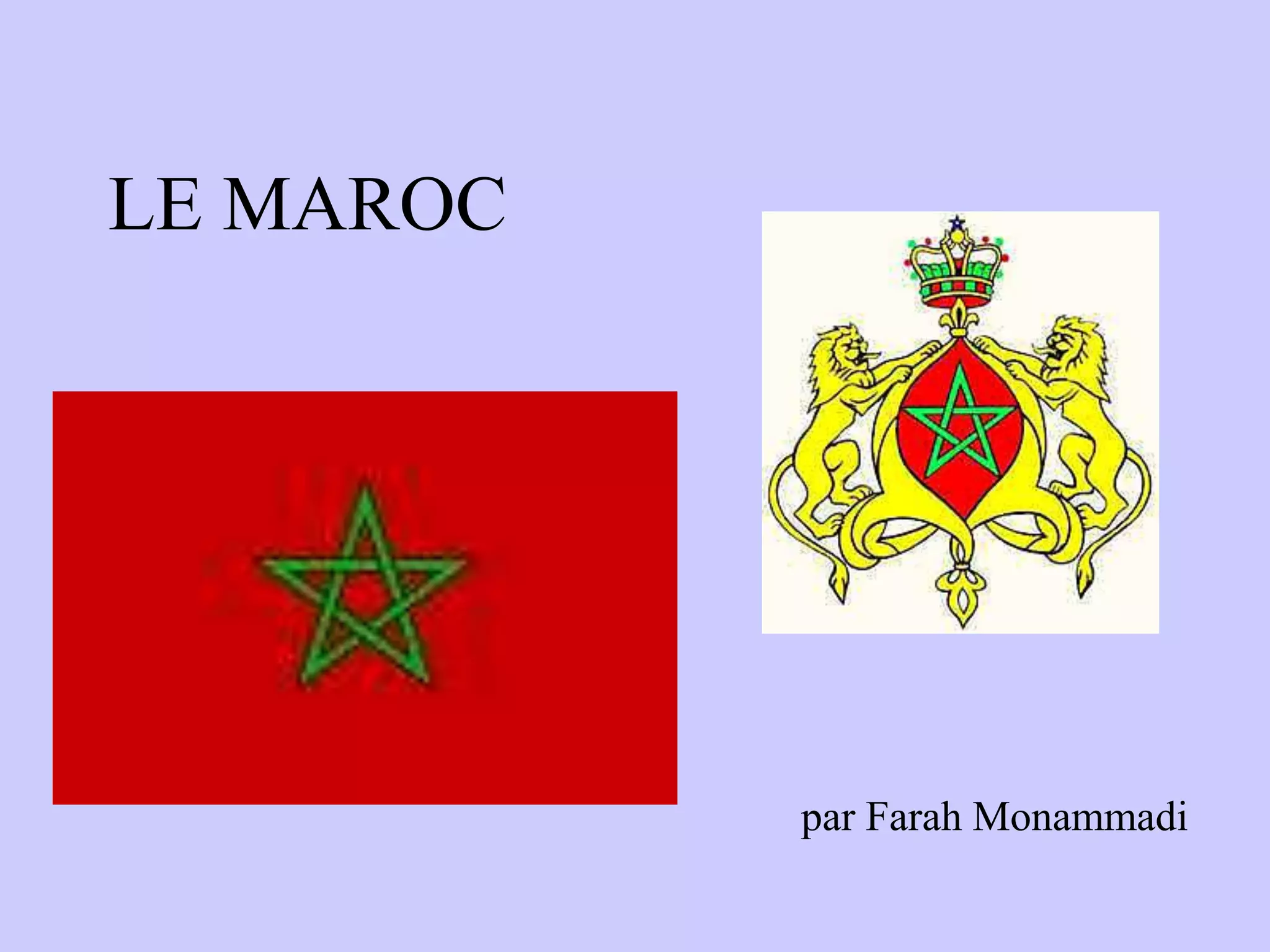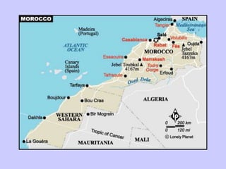 Le Maroc, situé au nord du Sahara, a une superficie d'environ 450 000 km² et une population de 30 millions d'habitants. C'est une monarchie parlementaire avec Rabat comme capitale et Casablanca comme ville importante, où l'arabe est la langue officielle et le français largement parlé. Le pays, majoritairement musulman, a des industries clés dans l'agriculture, le textile, l'exploitation minière et le tourisme, avec une cuisine réputée, incluant le célèbre couscous.