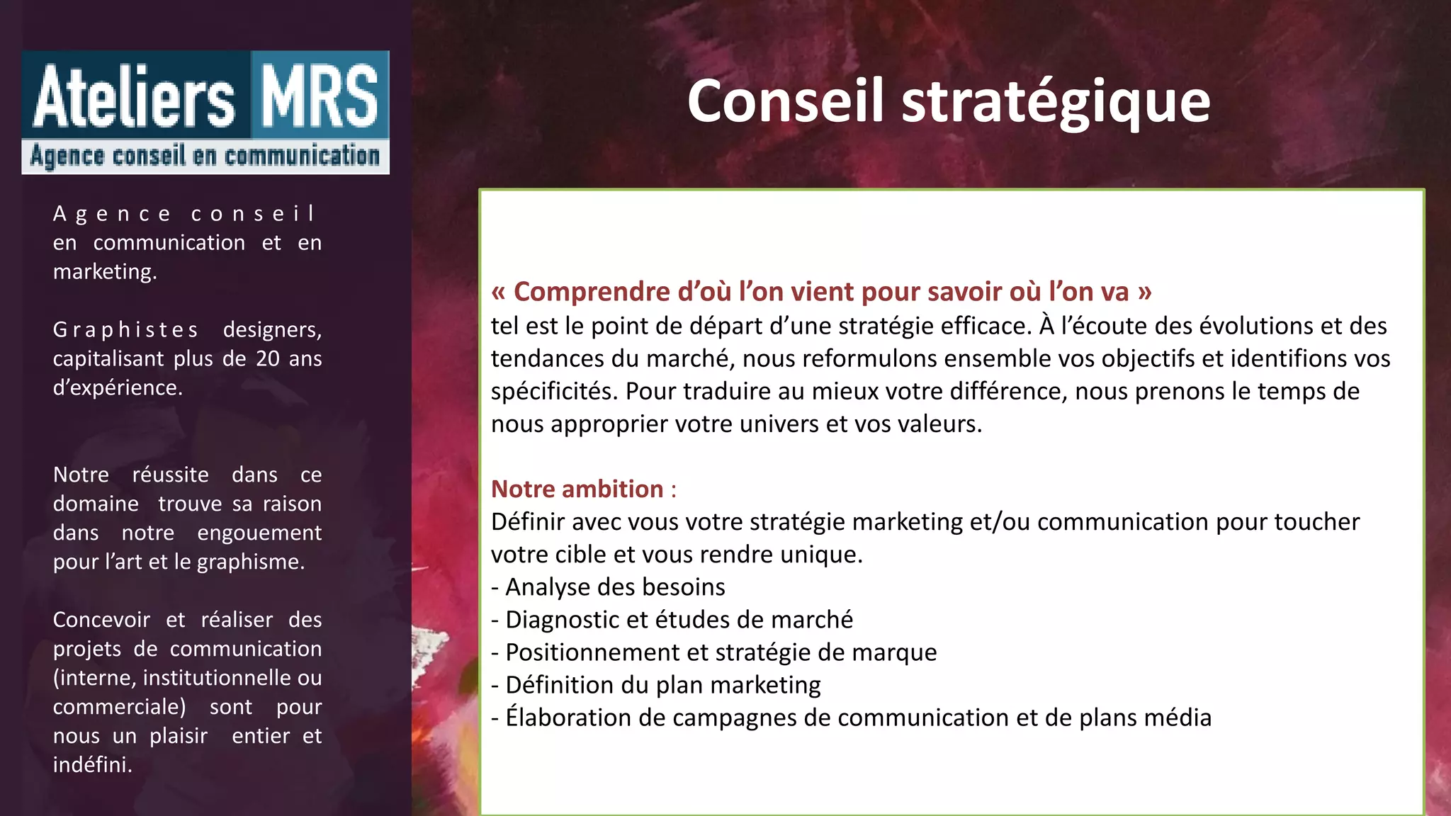 L'agence de communication et de marketing se spécialise dans la conception graphique et la réalisation de projets de communication, s'appuyant sur plus de 20 ans d'expérience. Elle offre une gamme complète de services allant du diagnostic de marché à la création de supports graphiques et de packaging, en passant par la stratégie de marque et la conception de stands. À travers leur expertise artistique, ils visent à renforcer l'image de leurs clients et à les distinguer sur le marché.