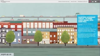 Le site ocpm.qc.ca offre des outils pédagogiques, des références et des documents liés aux consultations publiques tenues par l'Office. Il permet de trier divers mémoires, transcriptions et rapports par arrondissement, type ou année. Parmi les projets de développement présentés figurent des initiatives de réaffectation et de redéveloppement à Montréal entre 2008 et 2015.