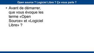 Le document présente le concept de l'open source et du logiciel libre, en expliquant ses quatre libertés fondamentales et son historique. Il aborde également les avantages et inconvénients des logiciels open source, en citant des exemples comme Android et en clarifiant certains mythes communs. Enfin, il souligne l'adoption croissante des logiciels libres par diverses organisations et ressources pour approfondir le sujet.