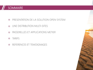 Le document présente la solution de réservation en ligne 'Open System' utilisée dans plus de 40 départements français pour faciliter la commercialisation en ligne des prestations touristiques. Il décrit ses fonctionnalités, y compris une interface intuitive pour les hébergeurs, des passerelles de connectivité avec des logiciels tiers, et des options de paiement. De plus, il souligne les tarifs abordables et l'accompagnement proposé par Vendée Expansion pour les acteurs du tourisme.