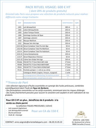Oriental Labs propose une gamme de soins visages naturels à base de figue de barbarie, riches en actifs précieux tels que les antioxydants et les vitamines. Les rituels incluent divers soins adaptés à différents types de peaux et visent à offrir une expérience sensorielle tout en améliorant l'état de la peau. La marque offre également des produits supplémentaires pour maximiser le potentiel de vente et fidéliser la clientèle.
