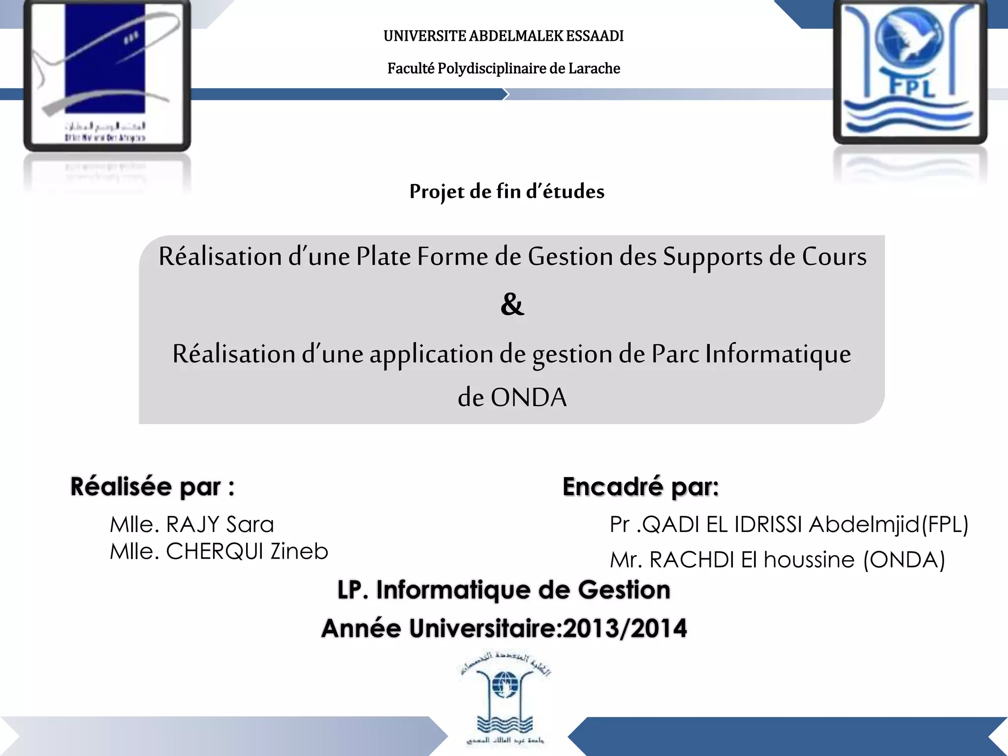 Le document présente un projet de fin d'études visant à réaliser une plateforme de gestion de supports de cours et une application de gestion de parc informatique, encadré par l'Université Abdelmalek Essaadi. Il aborde divers contextes, problématiques et objectifs liés à la gestion d'actifs, ainsi qu'à la mise en place d'outils de veille concurrentielle pour des OPCVM obligataires. Une méthodologie de travail est également décrite, incluant l'analyse des données, le développement d'un modèle de valorisation et la modélisation des performances des fonds.