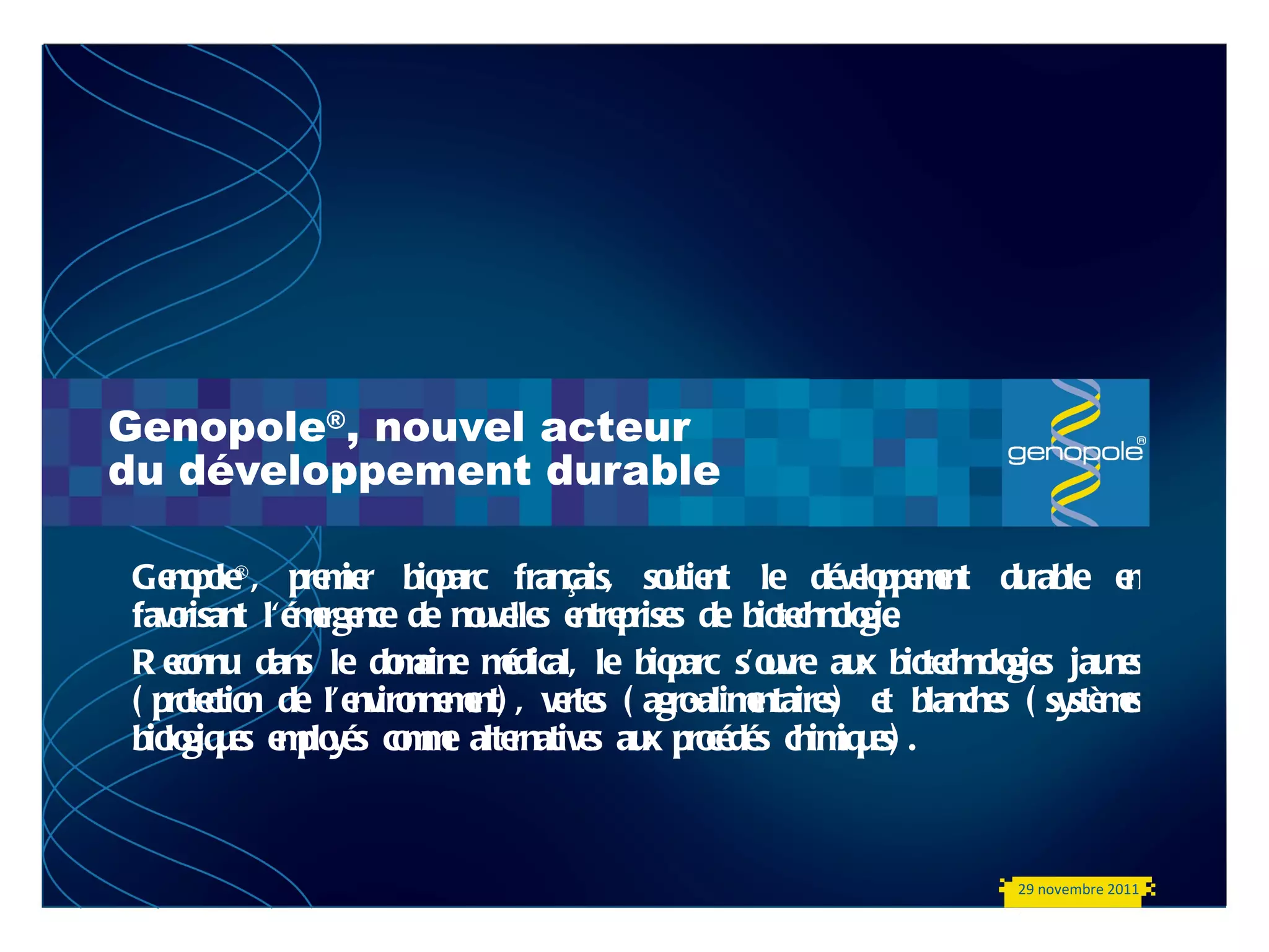 Genopole est le premier bioparc français dédié à la biotechnologie et au développement durable, soutenant l'émergence d'entreprises dans divers secteurs. Situé dans la région du Grand Paris, il regroupe des milliers d'entreprises et d'institutions de recherche, facilitant la création et le développement d'initiatives innovantes. Depuis sa création en 1998, Genopole a connu une forte croissance en termes d'entreprises, d'emplois et d'infrastructures.