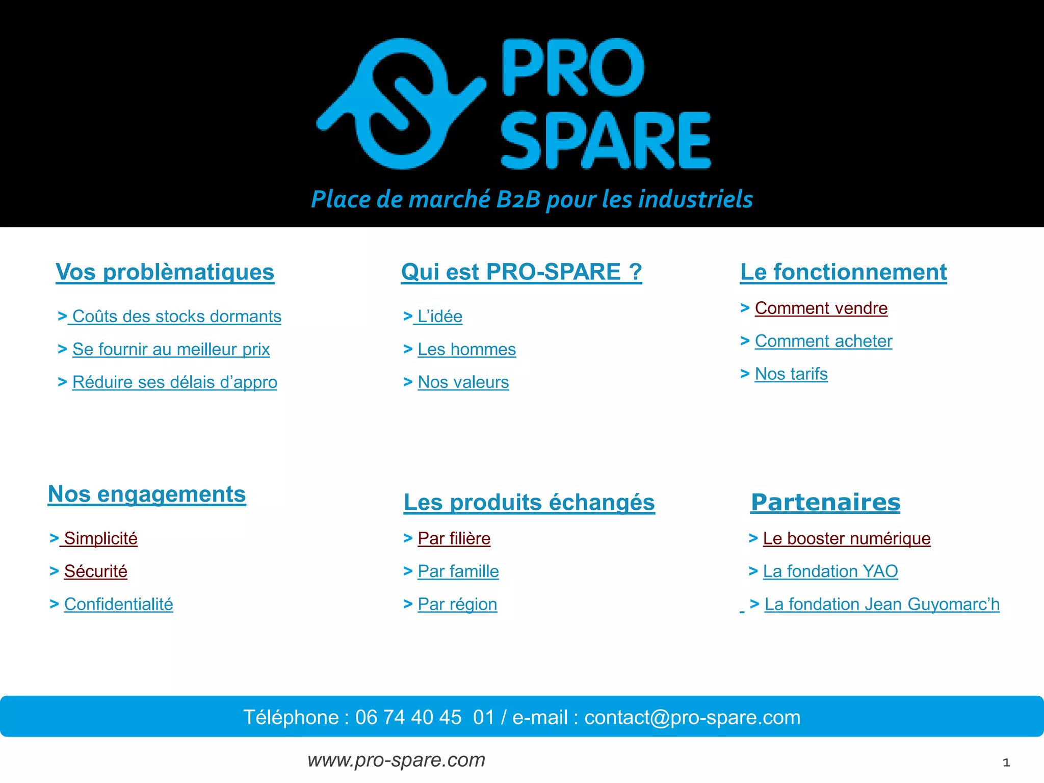 Pro-Spare est une plateforme B2B qui aide les industriels à optimiser leurs stocks et à réduire les coûts associés aux stocks dormants. En facilitant l'achat et la vente entre industriels, elle assure des délais d'approvisionnement rapides tout en garantissant simplicité, sécurité et confidentialité. Les transactions sont réalisées en toute transparence, avec une commission sur les ventes, tout en s'inscrivant dans une démarche environnementale.