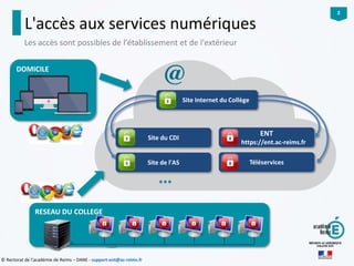 Le document présente les services numériques disponibles pour les parents et les élèves au collège, y compris l'accès aux sites web éducatifs et aux outils en ligne. Il met l'accent sur l'importance des identifiants pour accéder à ces services et décrit les fonctionnalités de l'Espace Numérique de Travail (ENT). Enfin, il explique les rôles des comptes pour les élèves et les responsables légaux dans l'utilisation des ressources numériques.