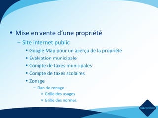 Le document traite des divers aspects liés à la mise en vente d'une propriété au Québec, incluant les documents nécessaires tels que l'acte de propriété, les hypothèques, et le certificat de localisation. Il mentionne aussi des éléments tels que les taxes municipales, les comparables de ventes récentes, et des statistiques sur le marché immobilier. Enfin, il évoque les obligations légales des propriétaires et les informations requises pour faciliter la transaction.