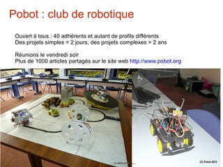 Le document présente un club de robotique, le Pobot, qui regroupe 40 membres avec divers projets allant de simples à complexes. Il décrit également le robot Nono, qui intègre des composants électroniques et utilise des technologies telles que Raspberry Pi et Arduino pour des fonctions variées. Les réunions ont lieu le vendredi soir et plus de 1000 articles ont été partagés sur leur site web.