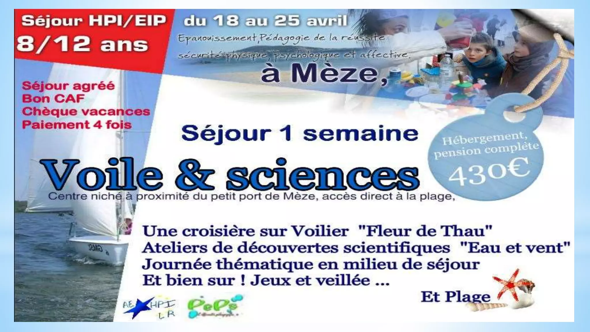 Le centre situé près du port de Mèze offre un emplacement idéal avec terrasse et accès direct à la plage. Il dispose de 16 chambres pour 2 à 4 personnes, d'une grande salle d'activité et de services de restauration adaptés aux jeunes. Des ateliers scientifiques et une croisière dans le bassin de Thau sont organisés lors d'un séjour d'une semaine.