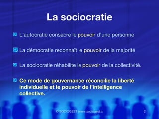 La sociocratie propose un mode de gouvernance qui équilibre liberté individuelle et intelligence collective, en répondant aux préoccupations des dirigeants pour une efficacité organisationnelle éthique. Ses principes incluent une prise de décision par consentement, des cercles décisionnels et un lien élu pour améliorer la communication et l'exécution des décisions. Cette approche vise à remplacer les structures pyramidales traditionnelles par une organisation dynamique et collaborative, favorisant ainsi la performance et la satisfaction des employés.