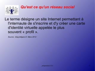 Le document présente un aperçu des réseaux sociaux, définissant ces plateformes comme des sites où les utilisateurs peuvent créer un profil et interagir avec d'autres membres. Il inclut des informations sur les dates de création de divers réseaux sociaux, tels que Facebook et LinkedIn, ainsi que des statistiques concernant le nombre d'utilisateurs dans le monde et en France. Enfin, il aborde l'évolution du nombre d'utilisateurs sur Facebook au fil des années.