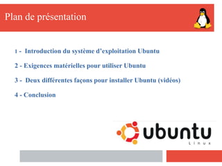 Le document présente le système d'exploitation Ubuntu, ses exigences matérielles et les méthodes d'installation. Ubuntu est une distribution Linux libre qui requiert un processeur d'au moins 1 GHz et 1 Go de RAM pour une installation basique. Deux méthodes d'installation sont abordées : l'installation à côté de Windows et l'utilisation d'une machine virtuelle.