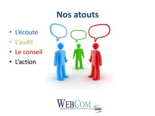 L'agence de communication se distingue par son écoute, son audit, son conseil et son action. Elle propose divers services, incluant l'événementiel, la création de sites web et des solutions graphiques. L'agence se concentre sur la stratégie de commercialisation et le marketing pour améliorer la satisfaction client et la fidélisation.