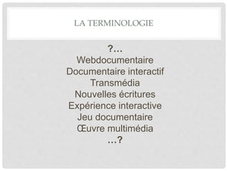 Le document traite des spécificités et évolutions du documentaire interactif, en présentant des terminologies comme 'webdocumentaire', 'i-doc' et 'transmedia'. Il met en lumière les caractéristiques du numérique dans la narration interactive, ainsi que les rôles d'auteur dans ces expériences. Enfin, il aborde les futurs possibles en lien avec l'intelligence artificielle, la réalité virtuelle et les tendances du marché.