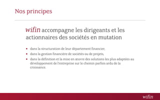 Le document présente les activités de 'nos principes', un conseil financier spécialisé dans l'accompagnement des dirigeants et actionnaires d'entreprises en croissance, notamment dans la structuration financière et la gestion de projets. Il met en avant une méthodologie pragmatique fondée sur l'expérience de ses membres et propose divers types de missions comme DAF externe, gestion de la trésorerie et levée de fonds. L'agence se veut à l'écoute de ses clients et s'adapte aux besoins spécifiques tout en assurant une gestion flexible de ses interventions.