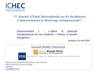Youssef Ouadi discute de l'importance de développer la pensée divergente pour libérer le potentiel entrepreneurial des étudiants, affirmant que l'entrepreneuriat est un comportement pouvant être appris plutôt qu'une caractéristique innée. Le document souligne la nécessité de réformer le système éducatif pour encourager la créativité et l'esprit d'entreprise, en faveur d'une approche facilitant l'apprentissage plutôt que d'un simple enseignement. Enfin, il aborde des initiatives pour stimuler l'entrepreneuriat, y compris le soutien aux groupes cibles comme les jeunes, les femmes et les immigrants.