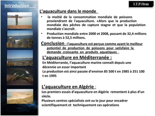Le document présente une étude préliminaire sur le barrage de Koudiet Lemdaour en Algérie, soulignant son rôle crucial pour l'approvisionnement en eau potable et en aquaculture dans la région. Il aborde les caractéristiques techniques du barrage, les espèces aquatiques présentes, et l'importance de l'aquaculture pour combler le déficit nutritionnel en protéines halieutiques dans la wilaya de Batna. En conclusion, le développement des activités aquacoles est jugé prometteur, nécessitant une formation et un soutien aux pêcheurs locaux.