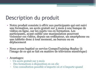 Le document présente un service appelé computraining-replay qui offre un accès gratuit de trois mois à une banque de vidéos en ligne pour aider les participants à se souvenir des concepts appris lors de formations. Ce service permet de visionner des vidéos sur différents appareils à tout moment et de n'importe où. Il mentionne également l'utilisation croissante des QR codes dans divers secteurs, y compris les musées, les transports publics et la culture populaire.