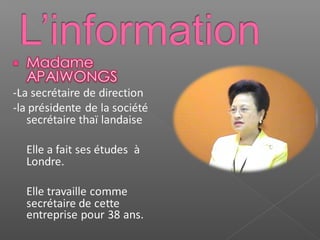 Le document présente des informations sur l'entreprise ExxonMobil et sa marque Esso, ainsi que des réflexions sur le travail, la responsabilité et la personnalité. Il évoque aussi le bonheur et des anecdotes liées à un secrétaire diplômé en marketing de l'université Chulalongkorn, actuellement en charge des affaires publiques. La provenance de l'information est également soulignée.
