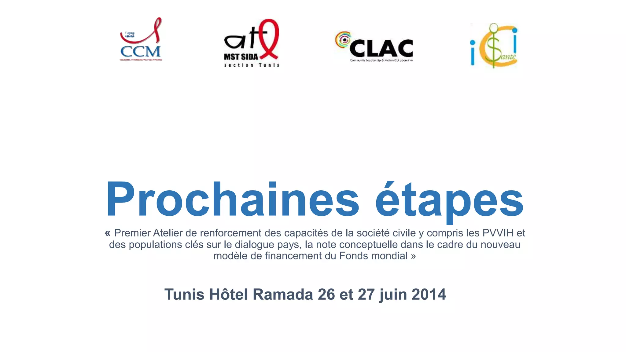 Le document décrit les étapes et les exigences pour renforcer les capacités de la société civile et des populations clés en Tunisie, notamment dans le cadre de la préparation d'une note conceptuelle pour le financement mondial. Il aborde la nécessité d'une collaboration inclusive entre divers acteurs, y compris des représentants de la société civile, du gouvernement et des ministères concernés, pour élaborer des stratégies efficaces pour lutter contre le VIH et d'autres maladies. Enfin, il met en avant des priorités d'intervention basées sur les besoins identifiés et les résultats escomptés d'ici 2017.