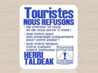 Le document décrit le pays basque en abordant sa carte, ses particularités territoriales et ses attraits touristiques. Il distingue plusieurs types de tourisme, tels que le tourisme balnéaire, de montagne, urbain, rural, récréatif, religieux et gastronomique. La langue basque et ses aspects culturels, sportifs et religieux sont également mentionnés.