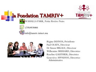 La fondation Tamriv+ a été créée en 2005 pour soutenir le développement harmonieux de la région ouest de l'île Maurice, en luttant contre l'échec scolaire et en améliorant les conditions de vie. Elle collabore avec diverses organisations et agences pour mettre en œuvre des projets axés sur le développement des enfants et le soutien aux familles, notamment à travers le programme 'Rezo West'. La fondation s'engage à coordonner les efforts des acteurs locaux et à fournir un appui technique pour répondre aux besoins des communautés.