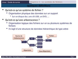 Ce document propose un guide sur le système de fichiers sous Linux, expliquant son organisation, les commandes de base pour naviguer dans l'arborescence, et les caractéristiques des disques durs. Il détaille également les partitions, la prise en charge des disques et les différents formats de systèmes de fichiers, ainsi que leur utilisation. Enfin, il présente des exercices pratiques pour aider à la compréhension des concepts abordés.