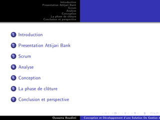 Le document présente le développement d'une solution de gestion de parc télécom, encadré par des professionnels de l'École Supérieure des Sciences Économiques et Commerciales de Tunis. Il aborde les besoins fonctionnels et non fonctionnels, utilise la méthodologie Scrum, et comprend des diagrammes et des outils spécifiques à la gestion de projet. En conclusion, il souligne l'importance d'une bonne gestion et prévoit l'ajout de nouvelles fonctionnalités dans le futur.