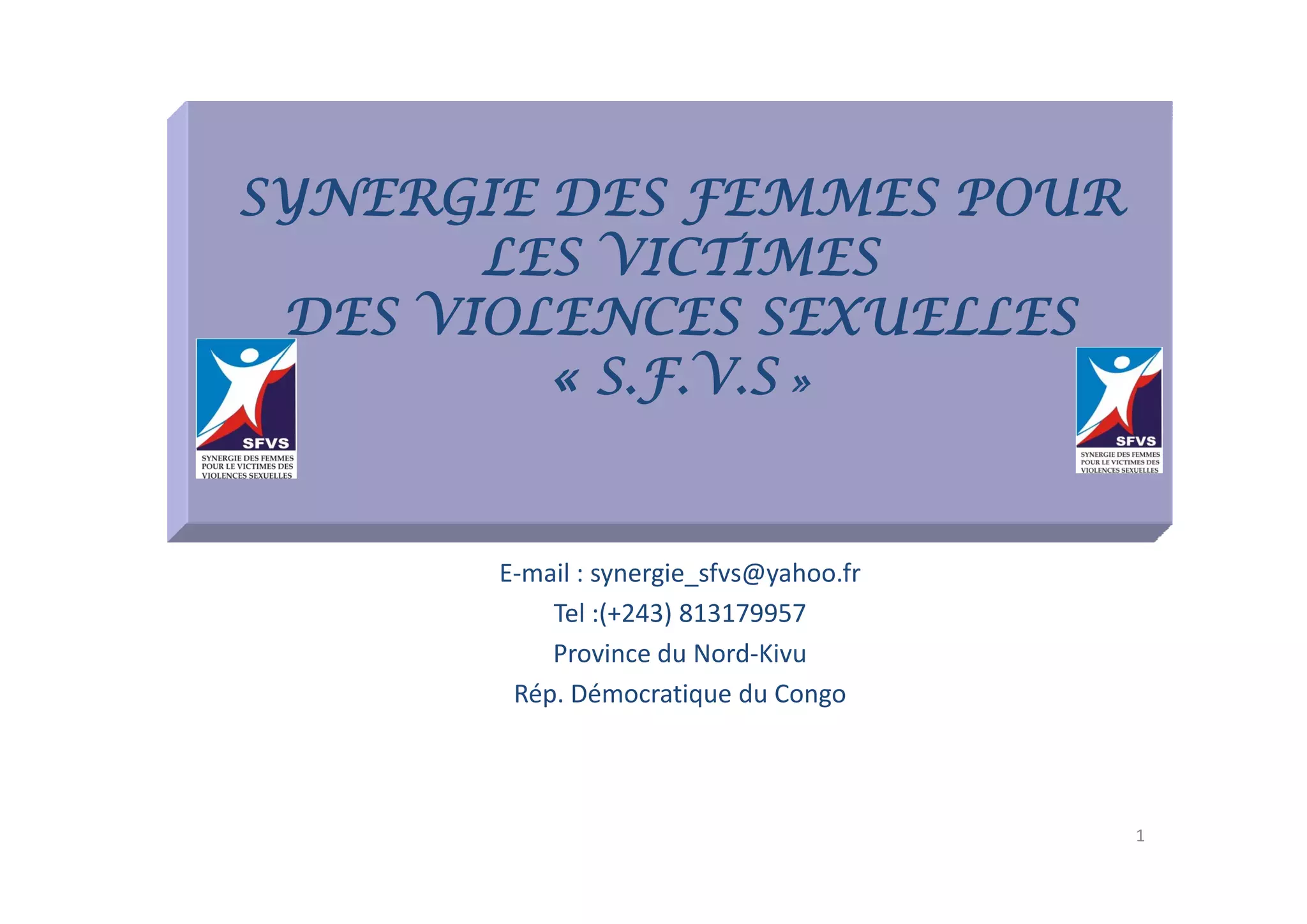 La Synergie des Femmes pour les Victimes des Violences Sexuelles (SFVS) est une coalition de 35 organisations visant à soutenir les femmes et les filles victimes de violences sexuelles en RDC. Elle sensibilise les communautés, offre des services psychosociaux et médicaux, et accompagne les victimes dans la recherche de justice. Malgré des succès, elle fait face à de nombreux défis, notamment l'insécurité et des lenteurs judiciaires.