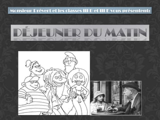 Le document présente un projet pédagogique sur Jacques Prévert et son poème, qui traite d'une scène de petit-déjeuner entre un homme et une femme, illustrant une tristesse et un silence pesant entre eux. À travers une biographie de l'auteur et des activités variées, les élèves explorent les thèmes du poème tout en apprenant la langue française. Le texte propose également des adaptations créatives et des analyses pour encourager la compréhension littéraire et le travail collaboratif.