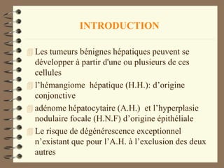 Le document traite des tumeurs bénignes du foie, notamment des hémangiomes, adénomes et hyperplasies nodulaires focale, en détaillant leur diagnostic et traitement chirurgical. Il souligne la prédominance féminine, l'incidence faible et les méthodes d'imagerie pour diagnostiquer ces tumeurs. Les résultats indiquent que la chirurgie pour ces tumeurs peut être effectuée avec un risque minime dans des services spécialisés.