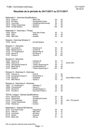 Le document présente les résultats des compétitions de basketball pour hommes et dames en national et divisions inférieures entre le 24 et le 27 novembre 2017. Divers matchs sont récapitulés avec les scores des équipes impliquées, incluant des équipes de cadets, scolaires et minis. Des notes précisent les matchs joués le jour même et les forfaits à vérifier.
