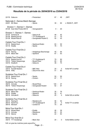 Le document présente les résultats des matchs de basketball pour la période du 20 au 23 avril 2018, incluant divers niveaux de compétitions masculines et féminines ainsi que des catégories de jeunes. Il respecte un format chronologique et inclut des détails sur les scores, les différentielles et les entraîneurs des équipes concernées. Les matches importants sont signalés en gras, indiquant ceux joués durant la période spécifiée.