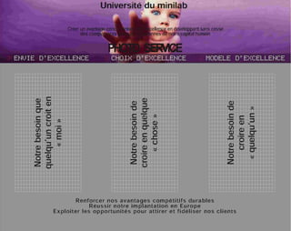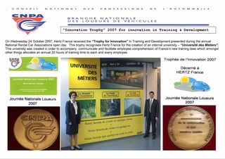 Le document présente un programme d'intégration et de formation au sein de Photo Service, visant à promouvoir l'excellence et la satisfaction client dans le secteur de la photo. Il détaille les rôles des formateurs et les objectifs du programme, ainsi que les attentes pour les stagiaires, tout en mentionnant la stratégie de Hertz pour améliorer l'expérience client. Enfin, des informations sur l'équipe en charge de ce programme et des initiatives globales pour renforcer la fidélité et l'engagement des clients sont également fournies.