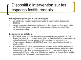 Le dispositif d'intervention sur les espaces festifs rennais, piloté par le CRIJ Bretagne, vise à promouvoir la prévention et la réduction des risques liés à la consommation de substances psychoactives lors des événements festifs. Établi en 2005, il inclut des actions comme les nuits Dazibao et un bus mobile offrant information et écoute, tout en mobilisant divers acteurs de la santé et du social. Les objectifs pour 2012 incluent l'amélioration des conditions de retour après les fêtes et le renforcement des partenariats avec les services de sécurité.