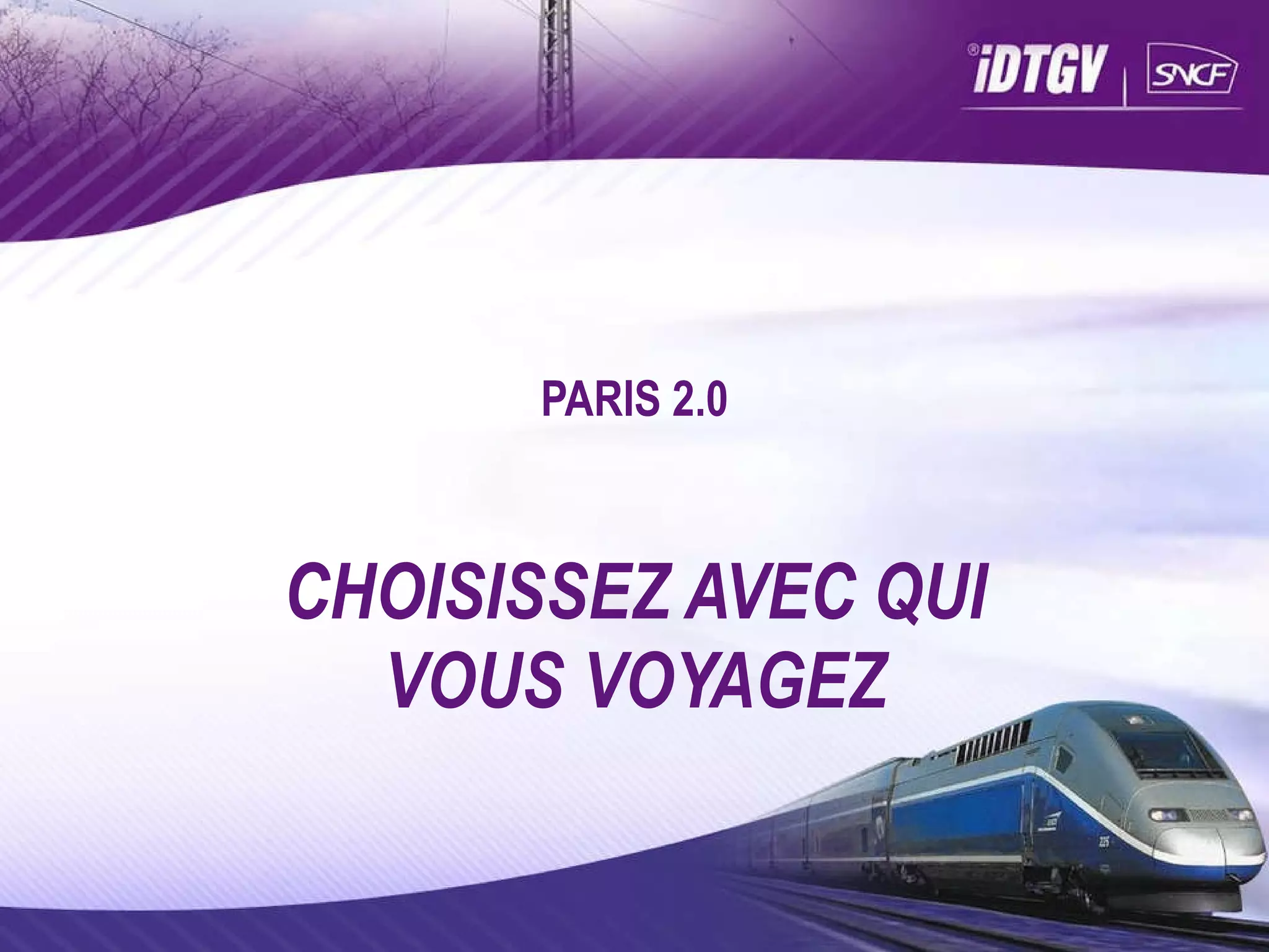 Paris 2.0, filiale de la SNCF créée en décembre 2004, propose plus de 30 destinations avec un taux de satisfaction client de 91%. Les passagers peuvent réserver, payer et imprimer leurs billets en ligne, avec des prix à partir de 19€ et des ventes ouvertes 4 à 6 mois avant le départ. Le service met l'accent sur l'intermodalité et la fluidité du voyage, tout en favorisant le lien social.