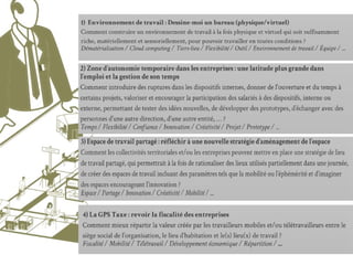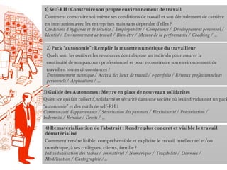 Le document analyse la transformation du travail dans une société numérique, soulignant la crise de l'emploi et l'impact des technologies sur les individus au sein des entreprises. Il explore des concepts tels que l'individualisation des tâches, la flexibilité, les nouvelles formes de travail collaboratif et l'importance des réseaux sociaux professionnels. Enfin, il met en lumière les défis et opportunités liés à la dématérialisation du travail, au co-working et à l'émergence d'une économie collaborative.