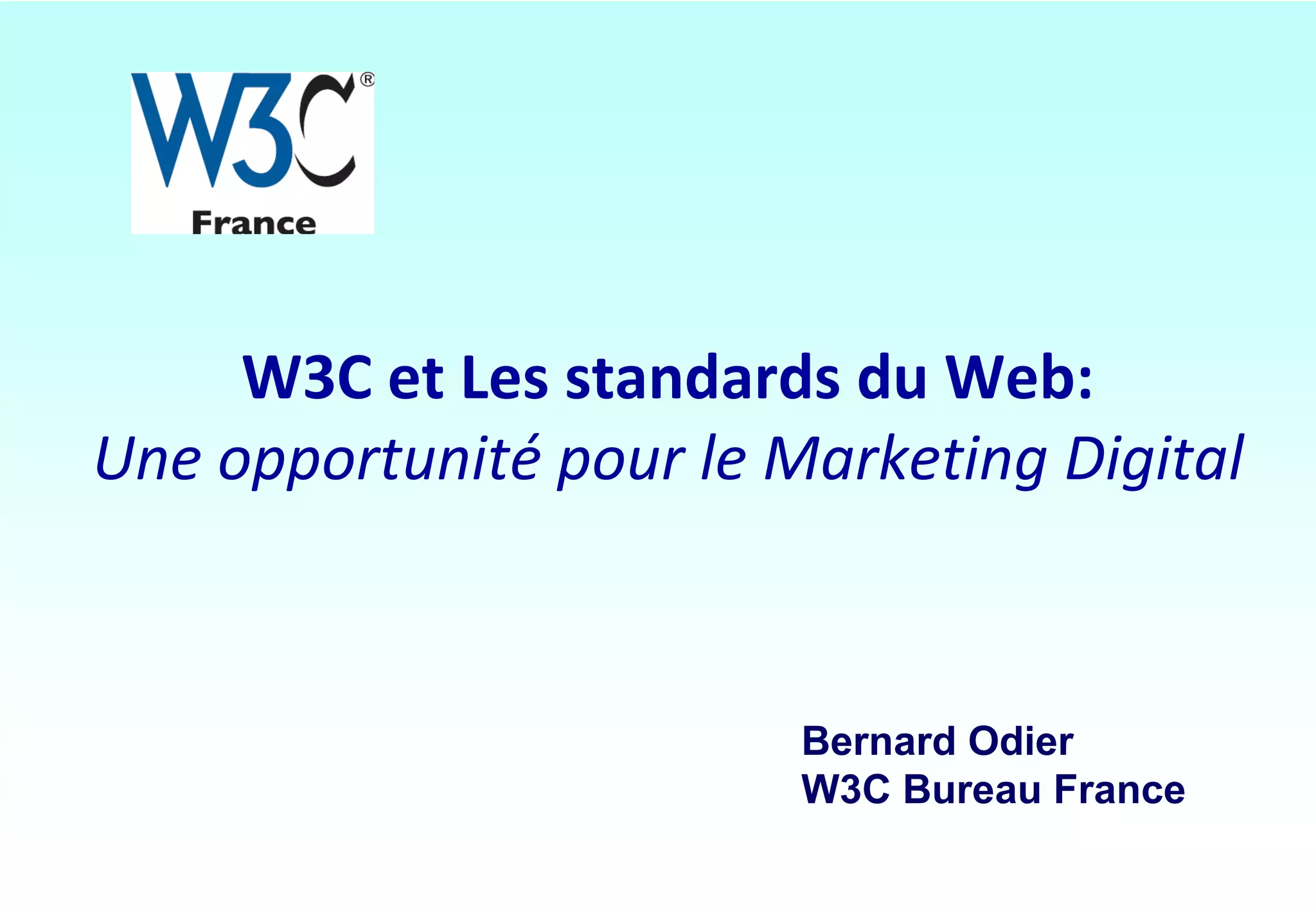 Le document présente l'évolution du marketing digital à travers les âges du web, de la vente en ligne à l'exploitation des données contextuelles grâce aux technologies du web sémantique. Le W3C, créé en 1995, vise à établir des standards gratuits pour optimiser l'interopérabilité des données et les applications web. Enfin, il souligne l'importance de considérer l'interaction des consommateurs avec leur environnement numérique dans ce nouveau marketing 3.0.