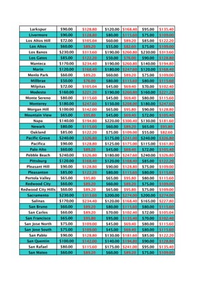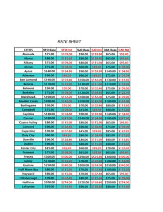 Le document semble être une feuille de taux avec des informations sur différents tarifs pour des emplacements spécifiques. Les données incluent des valeurs nettes et de base pour SFO, SJC et OAK. La mise en page est confuse avec des symboles et des caractères spéciaux, rendant difficile la compréhension des détails spécifiques présentés.