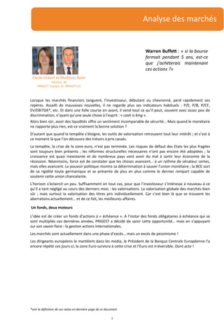 Le document analyse l'état actuel des marchés financiers, mettant en lumière un excès de pessimisme qui crée des opportunités pour les investisseurs, en particulier avec la création d'un nouveau fonds axé sur les actions à échéance 2020. Prigest, avec une expertise de plus de 30 ans, cible des actions sous-évaluées dans un contexte de crise, en s'appuyant sur des critères de valorisation rigoureux. L'objectif est de réaliser un rendement annualisé de 7%, en capitalisant sur le retour attendu à la moyenne historique des actifs.