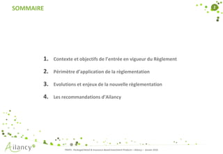 Le règlement PRIIPs vise à harmoniser l'information sur les produits d'investissement packagés de détail et fondés sur l'assurance, afin de garantir la transparence et la protection des investisseurs. Il impose la création d'un document d'information clé (KID) obligatoire, facilitant la comparaison entre produits, incluant des informations sur les coûts, les risques et les performances. Ce règlement, en vigueur depuis le 31 décembre 2016, s'inscrit dans un cadre réglementaire européen élargi pour renforcer la confiance des consommateurs sur les marchés financiers.