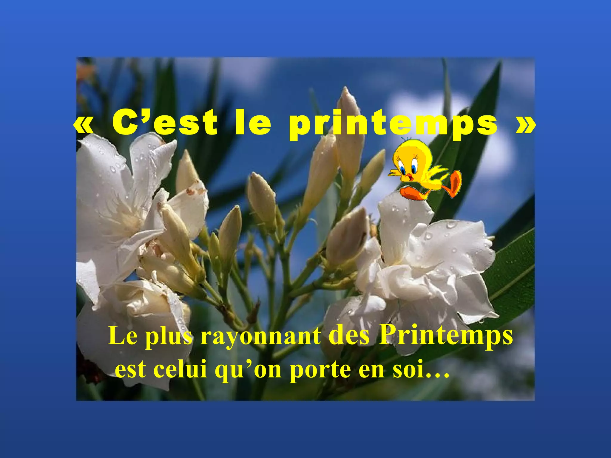 Le texte évoque la beauté et l'importance du printemps intérieur, soulignant que le plus joyeux des printemps réside en soi à travers le sourire et la joie. Il souhaite aux destinataires un printemps rempli d'espérance, d'amour et de lumière. L'encouragement à garder le sourire souligne l'optimisme et la réjouissance associés à cette saison.