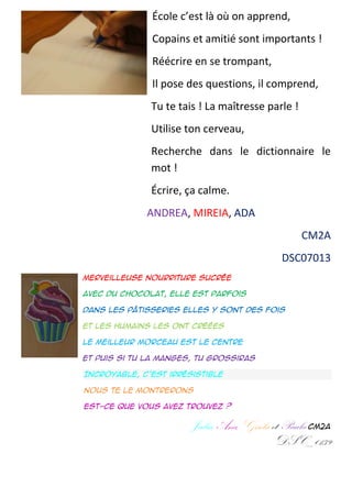 Le document présente une série de réflexions et de travaux d'élèves de CM2 sur divers thèmes, allant des animaux, de la nourriture, à la vie scolaire et la créativité. Chaque section reflète les pensées et les expériences des élèves, souvent avec humour et un ton léger. Le texte met en avant l'importance de l'école, de l'amitié, et de l'apprentissage tout en révélant leur imagination et leur plaisir d'écrire.