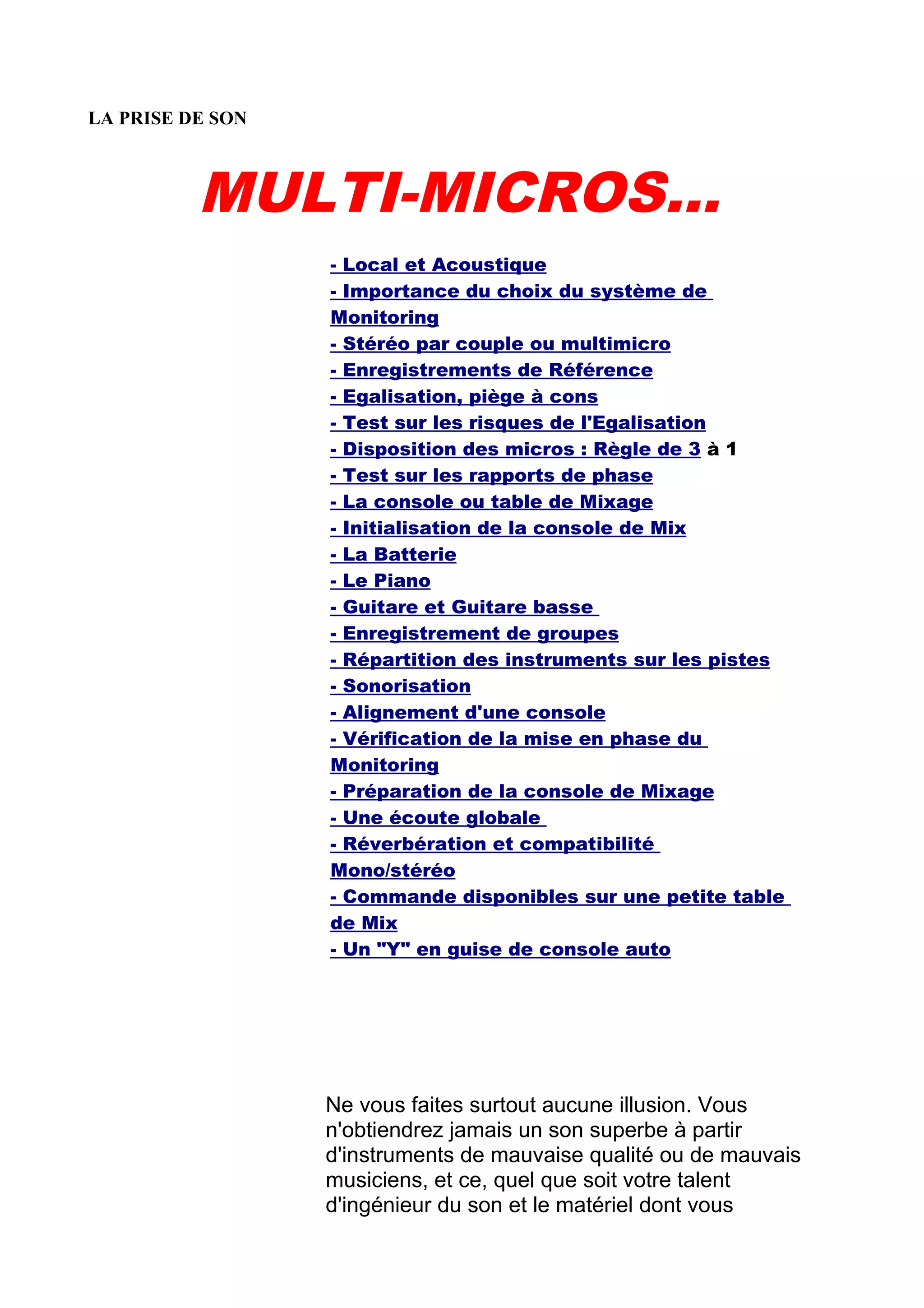 Le document aborde les techniques d'enregistrement audio, en soulignant l'importance du choix des micros, de la disposition acoustique et du système de monitoring pour obtenir un son de qualité. Il met en garde contre les pièges de l'égalisation et l'impact des techniques multi-micros sur la prise de son. Enfin, il insiste sur la nécessité d'écouter des enregistrements de référence pour éviter des erreurs esthétiques et garantir un bon résultat.