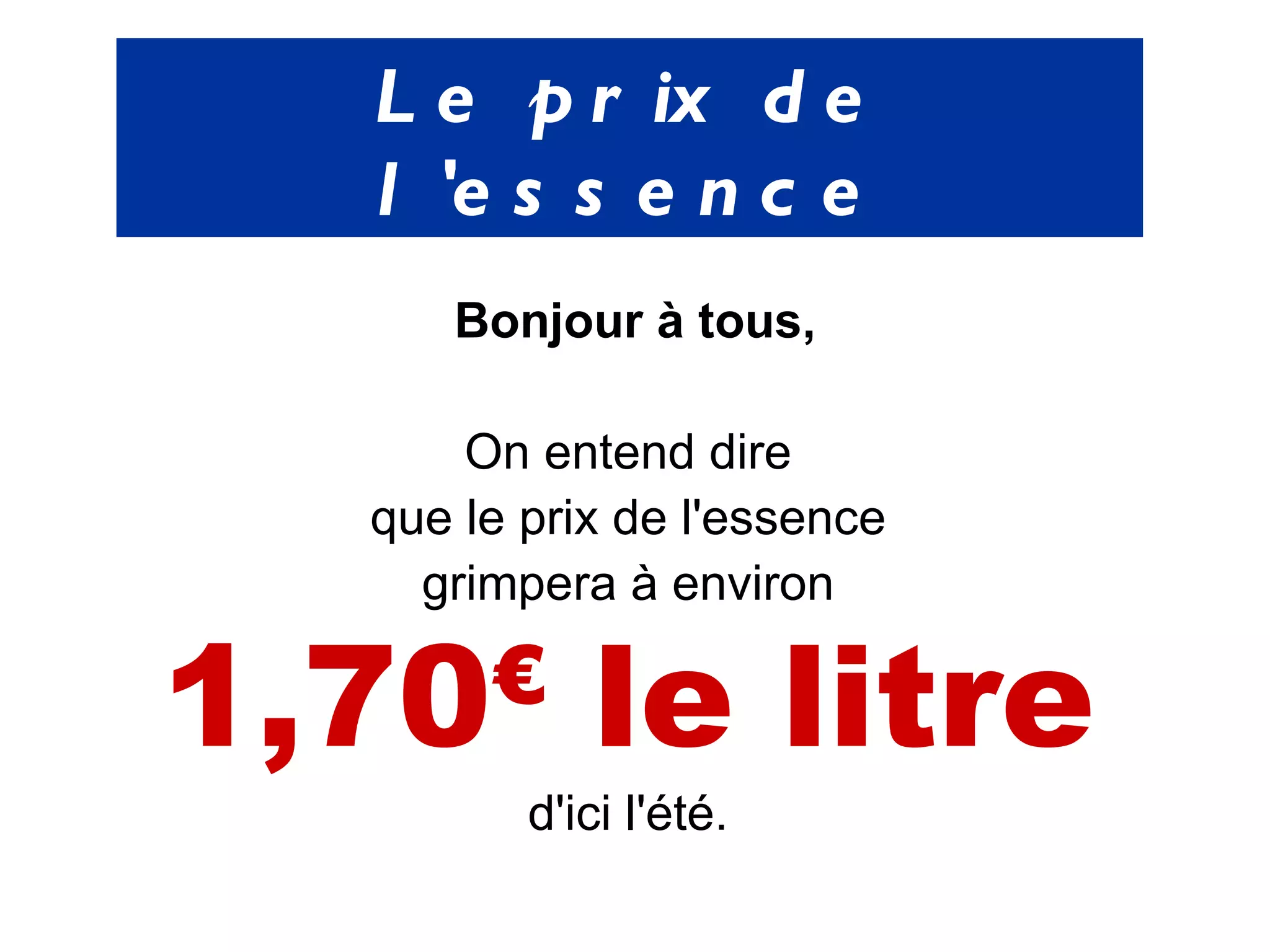 Le document évoque la hausse prévue du prix de l'essence à 1,70 € le litre et propose une stratégie collective pour faire baisser les prix en boycotant les deux plus grandes compagnies pétrolières, Total et Shell. En mobilisant un grand nombre de consommateurs par un envoi viral de messages, l'objectif est de déclencher une guerre des prix. L'auteur appelle à l'action immédiate et à la sensibilisation pour atteindre cet objectif.