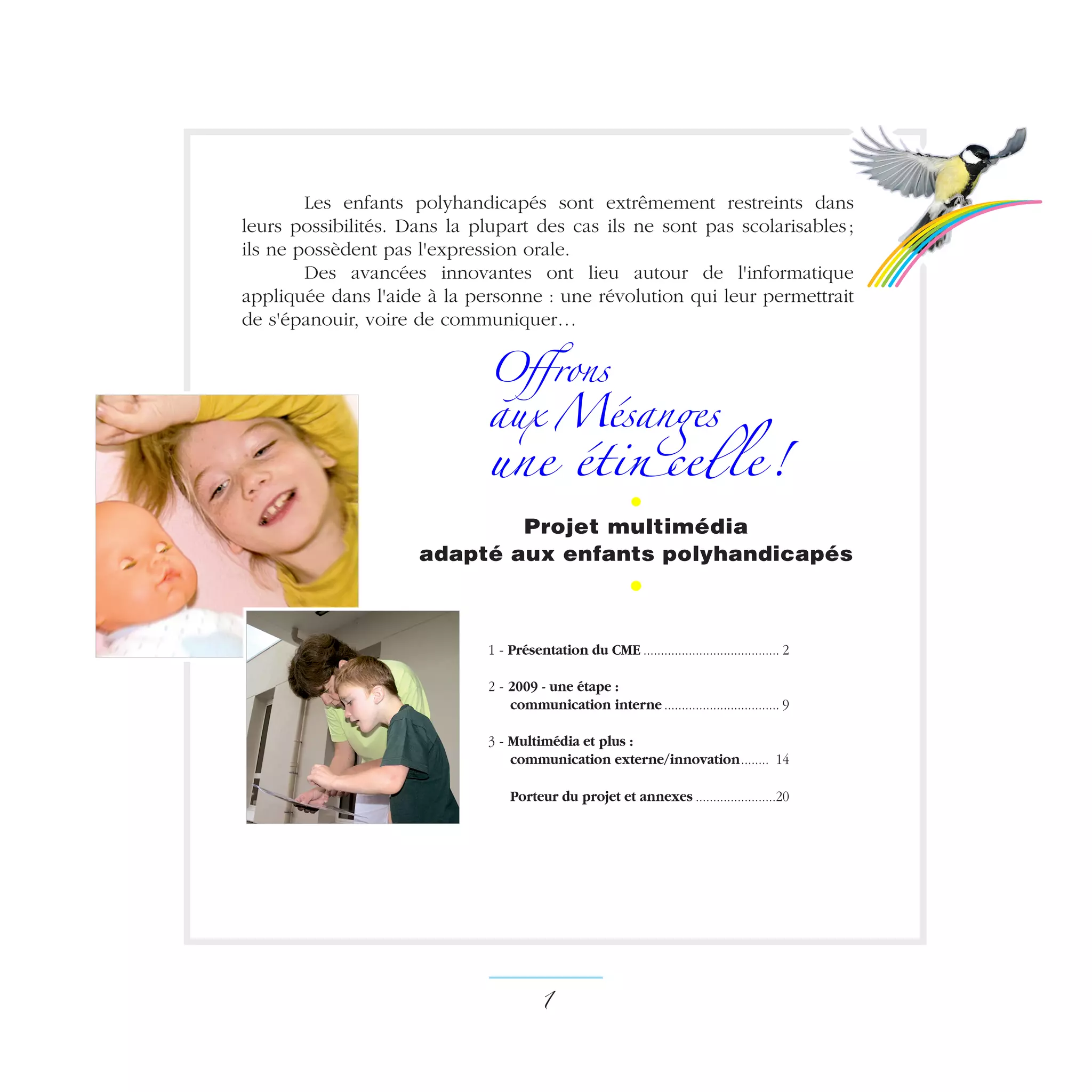 Le document présente le projet multimédia du centre médico-éducatif 'Les Mésanges', destiné à améliorer la communication et le développement des enfants polyhandicapés grâce à des technologies innovantes telles que l'interface cerveau-ordinateur. Ces avancées visent à offrir aux enfants un accès à de nouvelles expériences sensorielles et éducatives, en leur permettant de communiquer et d'interagir d'une manière adaptée à leurs besoins. Le projet met en avant l'importance de l'approche pluridisciplinaire et des collaborations pour favoriser l'épanouissement des enfants dans un environnement stimulant.