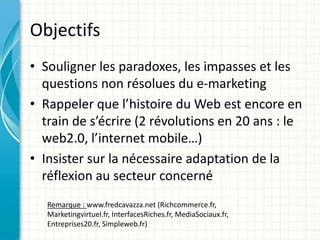 Le séminaire sur le e-marketing aborde les défis et questions non résolues dans divers secteurs, comme l'hôtellerie et la presse, face à des plateformes dominantes et l'évolution des modèles économiques. Il souligne l'importance de l'adaptation des stratégies e-marketing à chaque secteur, en tenant compte des innovations technologiques et des changements dans les comportements des consommateurs. Enfin, il touche aux enjeux juridiques, à la désintermédiation et à l'impact d'internet sur la relation client.