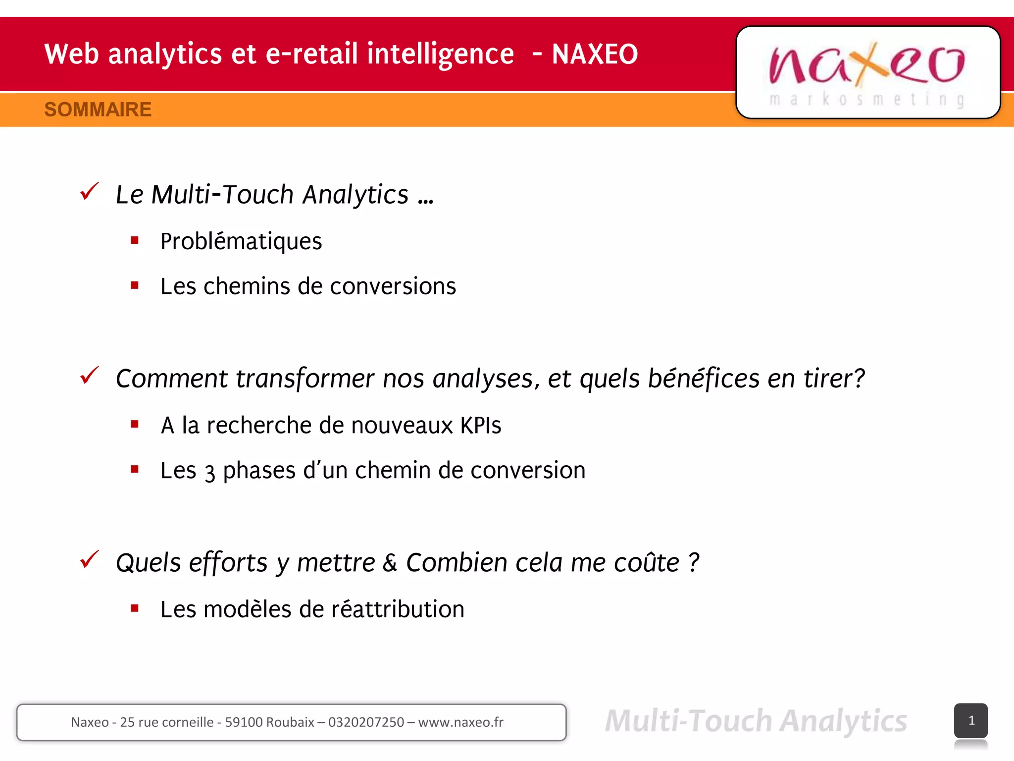 Le document traite de l'analyse multi-touch dans le domaine du e-retail, mettant en avant l'importance de comprendre les chemins de conversion des clients avant d'acheter. Il propose de nouveaux indicateurs KPI pour évaluer la performance des différents leviers marketing et souligne la nécessité d'attribuer les ventes à plusieurs points d'interaction au lieu de se concentrer uniquement sur le dernier levier. Le texte aborde également les modèles de réattribution pour mieux évaluer l'impact de chaque levier dans le processus d'achat.