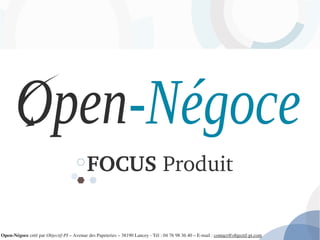 Open-négoces est un produit d'Objectif-Pi qui facilite la gestion des unités de prix et de commande, intégrant des référentiels complets pour clients et fournisseurs. Il permet également de calculer le prix de revient des matières achetées selon diverses méthodes, et d'adapter les étiquettes pour les produits en fonction des clients. Enfin, le système est flexible concernant les achats et ventes libres sans lien obligatoire avec un fournisseur ou un client.